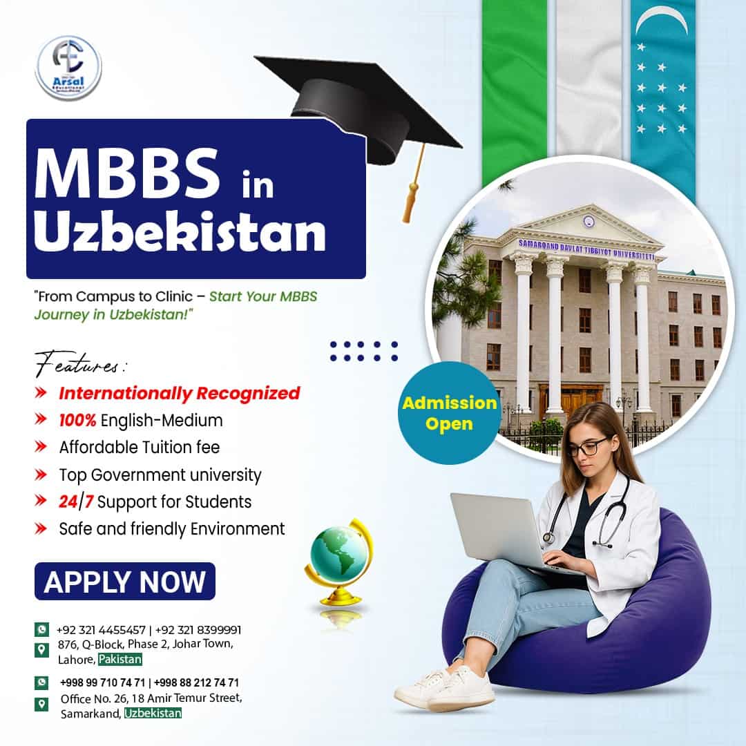Arsal Educational Services, founded in 2003 by Mr. Zabeeh Ullah Balaggan in Lahore, is a trusted overseas education consultancy specializing in MBBS in Uzbekistan. With over 20 years of experience, we guide students from Pakistan and Central Asia to top medical universities like Samarkand State Medical University, offering complete support from counseling and admission to visa and settlement.